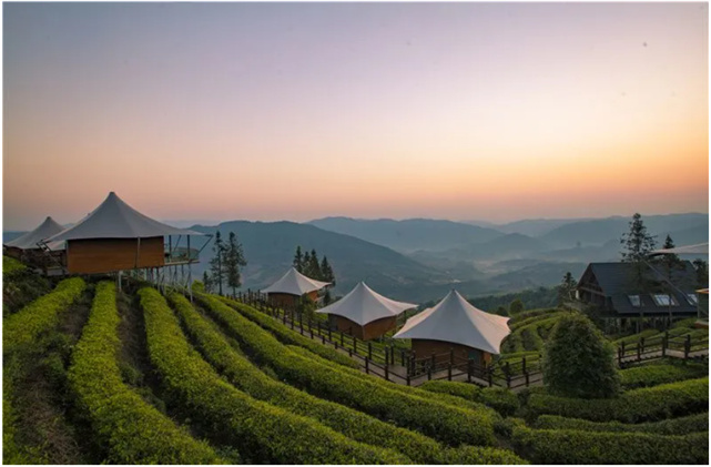 站在普洱倚象山營(yíng)地暨半山酒店的棧道上俯瞰下去,云海翻涌,茶園連綿,重巒疊翠,氣象萬(wàn)千,茫茫綠野。