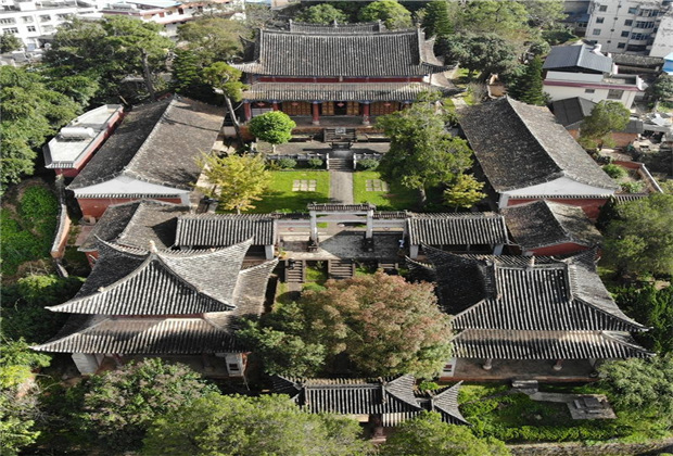墨江文廟始建于公元1821年,歷時十年建成,距今已有200年歷史,總占地7600平方米,為滇南規模最為宏大的古建筑群之一。1998年,墨江文廟被列為云南第七批省級文物保護單位,2019年被公布為第八批全國重點文物保護單位。墨江文廟坐北朝南,建筑隨地形逐層上升,止于峰頂,為臺階庭院式建筑,共六臺,每臺有左、中、右三級石階,均有石獅和牌樓,文廟內8棵周長為2.16米的球香木巨柱十分罕見。“昆蟲懼柱”“神龍托夢”為墨江文廟兩絕。